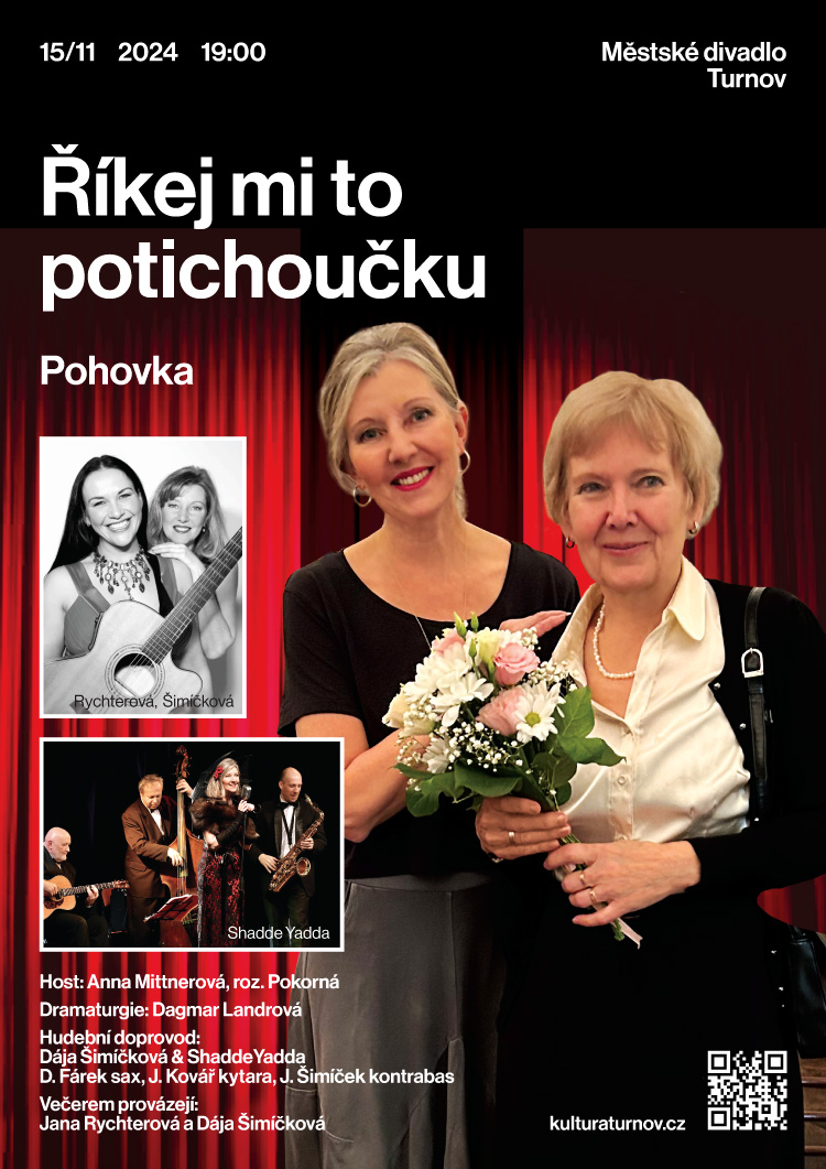 Pohovka s názvem Říkej mi to potichoučku se uskuteční v pátek 15. listopadu od 19 hodin v Městském divadle v Turnově. Lístky lze zakoupit osobně na recepci Kulturního centra Turnov, online na stránkách www.kulturaturnov.cz nebo i osobně v den konání na pokladně divadla. Ta se otevře hodinu před začátkem talk show.